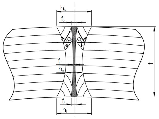 Particular attention should be paid to the heat-affected zone formed by the so-called “V”. Due to the skin effect and the proximity effect, dense high-frequency currents flow from the inductor, along the edge, to the closing point, and back through the opposite edge. This is the V-zone extending just in front of the closing point []. This means that the V-angle and the V-zone length in the HFI method must be as small as possible to maximize the current density and increase the resistive heating effect []. The heating capacity of HFI power sources can also be increased by taking advantage of stronger induced currents and higher resistance heating frequencies [].