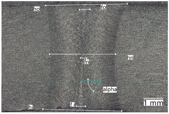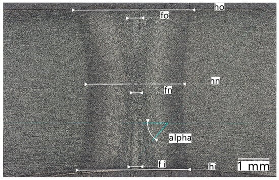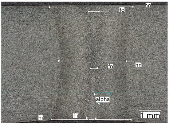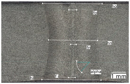 The geometric measurements of the microstructures confirm the symmetrical structure of joints 1 to 4 with an hourglass shape characteristic of the HFI process. It can be stated (Table 8) that the dimensions of the heat-affected zone (ho, hi, hn, fo, fi, and fn) were smaller for the inductor position 50 mm away from the welding point (samples 3 and 4). There was also a visible relationship between the flow line bend angle and the amount of squeeze, i.e., with the squeeze increased by 0.5 mm, the angle also increased to 50°. The use of the larger squeeze affected the flow line bend angle and had a positive effect, not only on the increase in temperature, but also on the quality of the joint. The larger squeeze caused the proper arrangement of the flow line, thanks to which we can more effectively discard impurities from the ferritic line, which was also confirmed in study []. Placing the inductor closer to the welding point resulted in a wider ferritic line, which is not relevant in the case of heating pipes []. According to the authors of study [], this may be important for pipes which need the ferritic line to be tested for impact resistance.