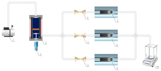 - Taking into account the morphology of fractures and the permeability of reservoirs, a three-level temporary plugging and turning evaluation device has been developed, which can simulate three-level turning fractures under conditions of 3–15 mm crack opening and different roughness. The different pressure levels of bursting discs are set between each level of fracture to achieve turning simulation under 5–30 MPa, achieving integrated simulation functions such as temporary plugging agent migration, plugging holes, turning, etc., in the wellbore.