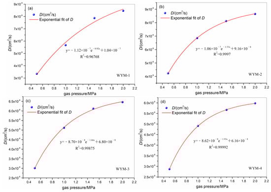 To explore the influence of changes in gas pressure on D, the change in D was measured using WYM-1, WYM-2, WYM-3, WYM-4, FM-1, FM-2, and six original columnar coal samples in the experiments. As shown in Table 3, the gas pressure was set to 0.5, 1.0, 1.5, or 2.0 MPa; the temperature was set to 31 °C; and the confining pressure was set to 6.7 MPa for the diffusion experiment. The experimental gas pressure conditions and results are summarized in Table 5.