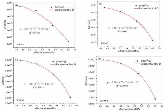 Effective stress refers to the difference between the confining pressure acting on a coal reservoir and the fluid pressure in its pores and fractures [26,35]. The data in Table 4 were used to plot the relationship between D and the effective stress generated by the change in the confining pressure (Figure 4). Figure 4 shows that the diffusion coefficient exponentially decreases with an increase in the effective stress, and the rate of decrease slightly slows as the effective stress increases. The exponential decrease in D with an increase in the confining pressure is thought to be determined by the change in the effective stress. According to the theory of material mechanics [52,53], coal deformation increases with stress. Therefore, when other conditions, including pore (gas) pressure, remain unchanged, as the confining pressure increases, the effective stress of the coal body continues to increase, causing the coal body deformation to increase continuously. The pores and throats in coal contract and deform under the action of effective stress, ultimately leading to decreases in coal-body porosity and D. D, similar to permeability [12,54], negatively affects the effective stress.