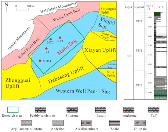 The Mahu Sag is situated in the northwestern part of the Junggar Basin, representing one of the six major hydrocarbon-rich sags in the region [], as depicted in Figure 1. To its northwest lies the Kebai Fault Belt and the Wuxia Fault Belt, while the southeastern boundary neighbors the Xiayan Uplift and the Dabasong Uplift. Previous studies have extensively investigated various aspects of the Fengcheng Formation in the Mahu Sag, including its sedimentary, structural, reservoir, and hydrocarbon generation characteristics [,]. Scholars assert that the deposition period of the Fengcheng Formation was a crucial phase in the development of the foreland basin on the northwestern margin of the Junggar Basin [], giving rise to a set of high-quality source rocks. This formation serves as a significant petroleum source in the Mahu Sag. During the deposition of the Fengcheng Formation, alternating wet and arid climates prevailed, and a pronounced evaporative environment led to a lowering of the lake level, salinization of the water body, and the development of alkaline minerals. Along the basin margins and slopes, deposition primarily occurred in marginal and shallow lake environments, while the central basin witnessed sedimentation in semi-deep-to-deep lake facies [].