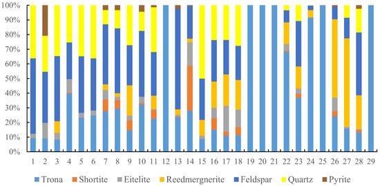The lithology of the Fengcheng Formation in the Mahu Sag is complex, with a diverse range of mineral types and significant variations in their content. The mineral characteristics of this formation bear similarities to the Green River Formation of the Eocene Uinta Basin in the eastern part of Utah, USA []. This article selects 29 cores with different alkaline mineral contents for X-ray diffraction experiments to analyze their main mineral composition (Figure 2). It can be seen from the figure that the main minerals of the Fengcheng Formation are feldspar, alkaline minerals, and quartz, Among them, feldspar content is the greatest, ranging from 10% to 70%, and most of them range from 20% to 50%. This coring mainly comes from the Feng-2(P1f2) segment, so the content of alkaline minerals is relatively high, with a total number of alkaline minerals ranging from 0 to 60%. Among the alkaline minerals, the content of trona is the highest, and some cores have a trona content of 100%, which is pure trona cores; the quartz content mainly ranges from 5% to 30%; simultaneously developing a small amount of pyrite, its content is generally less than 10%.
