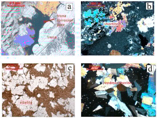 Trona minerals have low hardness and are prone to deliquescence in the air. They are highly soluble in water and react with fluids in the formation to form corrosion pores (Figure 3a); eitelite minerals are slightly soluble in water and easily soluble in acids, appearing colorless, and transparent in thin sections, often coexisting with shortite minerals [] (Figure 3b); shortite minerals are insoluble in water and slowly dissolve in acid, exhibiting polychromism under the microscope and having a glassy luster (Figure 3c); and the main mineral of silicate borate is reedmergnerite, which is insoluble in both water and acid and has a hardness greater than that of a knife (Figure 3d).