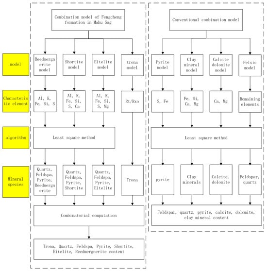 The study area features a diverse range of minerals. When employing a single-mineral model for mineral inversion, the increased number of unknowns amplifies uncertainty, leading to higher errors. Consequently, in practical mineral content inversion, a combined model is often utilized. This involves selecting characteristic elements for different minerals and accurately calculating mineral content based on the principles of optimization. At present, the Elan mineral calculation module from Schlumberger Company, Houston, TX, USA is commonly used for mineral inversion [,]: using sulfur element to calculate pyrite content; using silicon dioxide, magnesium carbonate, calcium carbonate, and iron element content to calculate clay mineral content; using calcium and magnesium element content to determine calcite and dolomite content; and calculating quartz, feldspar, and mica content using other element content []. The Fengcheng Formation shale oil reservoir develops a large amount of alkaline minerals, and the Elan module does not include the calculation of alkaline minerals. Therefore, based on the Elan module and combined with the characteristic elements in alkaline minerals, as is shown in Figure 5, this article adopts a combination model method to establish 4 mineral interpretation models: Shortite Model (feldspar, quartz, pyrite, and shortite), Eitelite Model (feldspar, quartz, pyrite, and eitelite), Reedmergnerite Model (feldspar, quartz, pyrite, and reedmergnerite), and Trona Model. By combining and calculating 4 models, mineral inversion of alkali-bearing shale oil reservoirs is achieved.