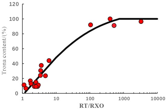 The main mineral in alkaline minerals is trona, which is easily soluble in mud during actual production, resulting in wellbore collapse. However, the radial detection depth of Litho Scanner Log is only 23 cm [], and the Litho Scanner Log data in trona development intervals are distorted. Trona dissolves in the mud, increasing the mineralization degree of the mud, leading to a decrease in the mud resistivity. Therefore, in layers with high trona content, the ratio of the original formation resistivity to the flushing resistivity is relatively large. As shown in Figure 6, the red dot in the figure is the content of trona in the core, and the black trendline is the relationship between the ratio of virgin zone resistivity to flush zone resistivity and trona content established by sigmoid function [] (Equation (5)).