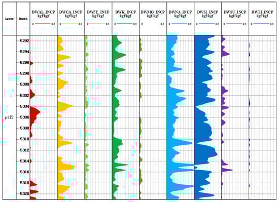 The yield of Al, Si, Ca, Fe, K, Na, Mg, S, Ti, and Gd was used to calculate the dry weight of formation elements based on the oxide closure model. The core idea of the oxide closure model is that all minerals in the formation are composed of oxide and carbonate, and the sum of percentage of oxide and carbonate content is 1; the sum of the mass percentage of all elements is also 1 []. As shown in Equations (9) and (10), the content of major elements in the rock skeleton can be calculated by the yield of each element and the oxide index. The oxide closure model is used to normalize the oxide and carbonate minerals, which overcomes the problem that it is difficult for instruments to measure the yield of carbon and oxygen []. Figure 7 and Figure 8 are the results of element dry weight calculation of Litho Scanner Log in the Fengyun 1 well and Mahu 54 well, respectively.