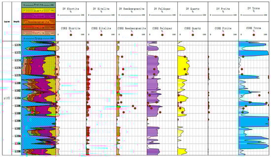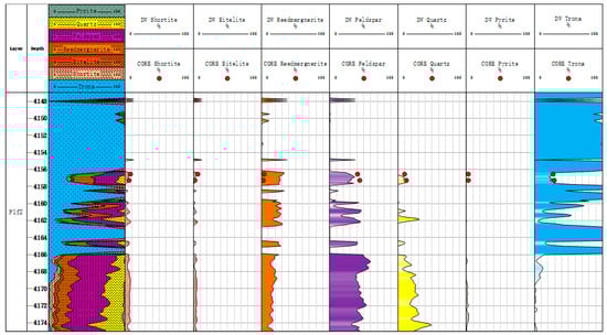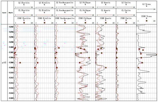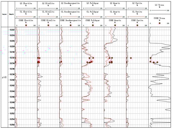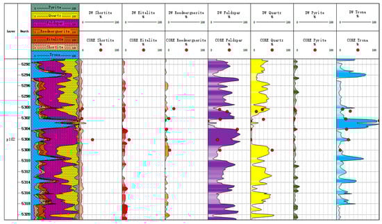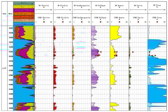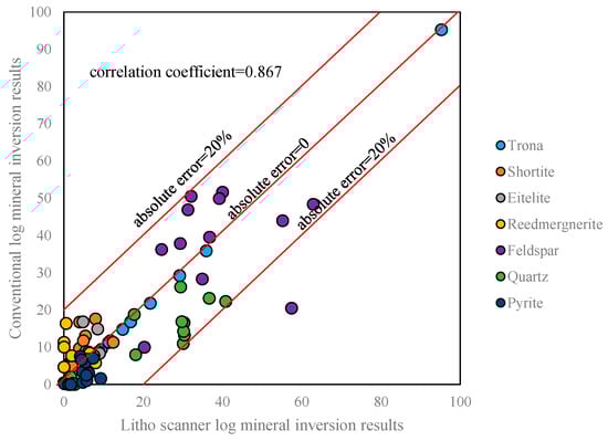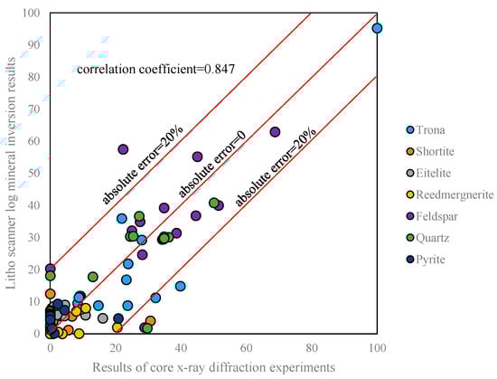 If we compare the mineral inversion results with the core X-ray diffraction experimental results, as shown in Figure 9 and Figure 10, we can see that the third trace is the inverted mineral profile. From the beginning of the th to 10th tracks, they are composed of a shortite component, eitelite component, reedmergnerite component, feldspar component, quartz component, pyrite component, and trona component. This is a gradient color fill, the darker the color the more mineral content. Pink fill channel is shortite; reddish brown fill channel is eitelite; brown fill channel is reedmergnerite; purple fill channel is feldspar; yellow fill channel is quartz; dark green fill channel is pyrite; blue fill channel is trona. The correlation coefficient between the mineral inversion results of Litho Scanner Log and the results of core X-ray diffraction experiment is 0.847. Most of the inversion results have an absolute error of no more than 20% from the core data, with the highest amount of trona among the core minerals with an absolute error of more than 20% (Figure 11). The mineral inversion results have good consistency with the core experiment results.