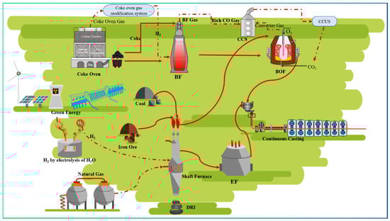 Existing steel smelting technology is based on fossil fuels as energy sources. This mainly includes coal, natural gas, hydrocarbon mixed fuel, and electric (electric arc furnace). Two main solutions exist for developing low-carbon or zero-carbon processes [20,21]. One solution is to replace coal with hydrogen and electricity in hydrogen-reduced or electrolytic iron ore, followed by introducing carbon capture and storage (CCS) or carbon capture utilization and storage (CCUS) technologies.