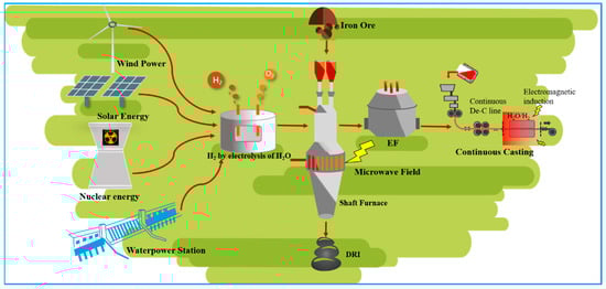 Given the characteristics of the existing energy structure and the bottleneck of hydrogen metallurgy technology, eliminating fossil energy and its hydrogen-rich gas without developing hydrogen smelting technologies to reduce gas emissions is impossible. In the short and medium terms, efforts should focus on energy efficiency and energy saving/recycling technologies [4,22] (Figure 1). For example, natural gas and hydrogen-rich direct reduction technologies should be used to further increase the proportion of hydrogen and strengthen the practical design of continuous processes to reduce heat loss. Applying renewable or pure green energy in metallurgical processes [23,24,25,26], such as the development of full hydrogen metallurgy to achieve zero carbon emission technology, should be promoted long-term (Figure 2).