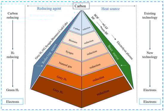 The left side of Figure 3 shows a gradual transition from carbon to pure hydrogen (green hydrogen) as a reducing agent. The traditional smelting process, represented by a blast furnace and converter, is gradually transitioning to the electrothermal smelting process, represented by an electric furnace. Furthermore, the problems of intermittent power generation and grid connection with renewable energy are solved, revolutionizing the heat source structure. The strong endothermic effect of the hydrogen metallurgy process will eventually be replaced by existing “carbon heat source” protection methodologies, such as arc heat, ion beam, laser, and other “non-carbon heat source” protection strategies.