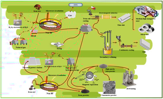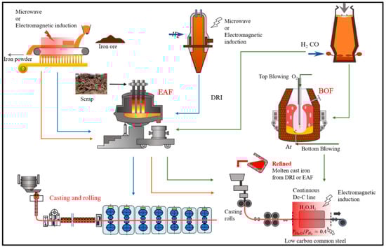 - Iron ore is directly reduced to a hydrogen reduction product (DRI) by a hydrogen-rich base under microwave irradiation. The amount of metal phase carburized in the gas-based reduction process is controlled by the amount of C/H in the reducing gas. The hydrogen reduction products obtained by direct reduction are mixed with a certain amount of scrap steel and melted into medium- and low-carbon molten steel in an electric furnace. After secondary refining, the molten steel is directly solidified into thin strips by thin-strip continuous casting equipment such as twin-roll continuous casting. Then, it is heated on-line by electromagnetic induction to prepare low-carbon or ultra-low-carbon steel strips in the form of gas–solid reaction decarburization. Alternatively, traditional medium-thick steel can be prepared by the continuous casting process [57,58].