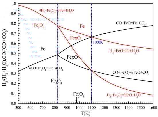 Figure 6 shows the thermodynamic equilibrium diagram of the Fe-O-H and Fe-O-C reduction reactions, reflecting the relationship between temperature and gas reducibility. Gas reducibility (H2/(H2 + H2O) or CO/(CO + CO2)) is the ratio of the reducing component to the non-inert component of the gas. Thermodynamic data were calculated by FactsageTM 7.2. Hydrogen reduction of iron ore is a strong endothermic process. With an increase in temperature, the stable area of Fe and FeO in the Fe-O-H system expands, while the stable area of Fe in the Fe-O-C system shrinks. At temperatures below 820 K, the order of Fe2O3 reduction by H2 and CO is Fe2O3-Fe3O4-Fe. The critical reducibility required for CO reduction is less than 0.49, and the critical reducibility required for H2 reduction is greater than 0.79. At temperatures above 820 K, the order of Fe2O3 reduction by H2 and CO is Fe2O3-Fe3O4-FexO-Fe. At temperatures above 1100K, H2 reduction is more advantageous than CO reduction.