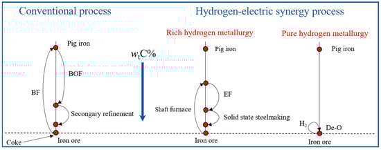 The schematic diagram of the oxygen potential change in the process of modern steel smelting is shown in Figure 9. In contrast to the traditional steel smelting process, the new ultra-short electro-hydrogen synergy process has fewer process nodes. Furthermore, it does not involve high-strength oxygen blowing without consuming a large amount of deoxidizing alloy, conducive to controlling inclusions and gases in steel and improving product performance and service life [59,60].