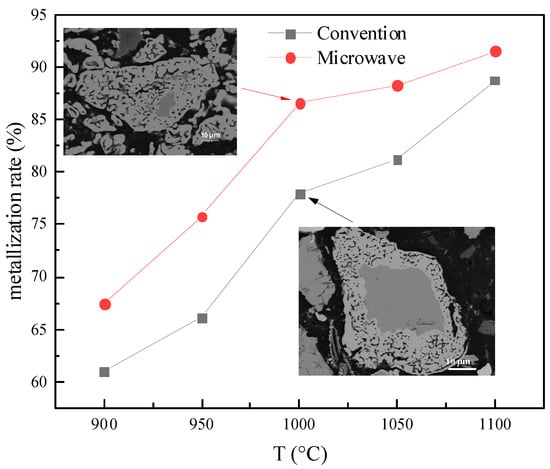 Magnetite was reduced by H2 at different temperatures for 40 min in microwave and conventional heating fields, respectively. Figure 10 shows that the metallization rate of magnetite reduced by H2 in the microwave and conventional fields increases with increasing heating temperature. However, at a constant temperature, the metallization rate of H2-reduced magnetite is higher under microwave heating, indicating that microwaves have a strengthening effect on the H2-reduction of magnetite, originating from the non-thermal effect of the microwave field. Nevertheless, the strengthening mechanism has yet to be clarified. A previous study [61] suggested that microwaves significantly increase the collision frequency between the reaction atoms. The microscopic results of magnetite after reduction at 1000 °C show that microwave and conventional heating fields have different effects on sintering, diffusion, and grain growth. After H2 reduction under a microwave field, obvious micropores appear in the particles. This is beneficial to the diffusion of gas during the reduction process and significantly affects the kinetic conditions of the reduction reaction. However, the mechanism of microwave-enhanced reduction requires further experimental study. The author believes that using phenomenological statistics and comparative methods to analyze the influence of microwave effects on the pre-exponential factor (representing particle collision entropy) and activation energy (energy barrier) to determine the relationship between reaction rate constant k or diffusion coefficient D and temperature T is necessary. The applicability of the existing hypothesis of microwave-enhanced chemical reaction processes is discussed below.