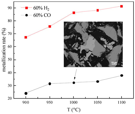 Magnetite was reduced by H2 and CO at different temperatures for 40 min in a microwave field. The metallization rate of magnetite after reduction is shown in Figure 11. Under microwave field heating, the reduction effect of H2 is better than that of CO. The microstructure of magnetite is reduced layer by layer by H2, and CO is carried to the center of the particles in a pointed manner. Fine iron ore is reduced by pure H2, and the angle between the surface and the Fe/Fe1−xO interface is smaller compared to pure CO [62]. Therefore, the migration paths of V//Fe and 2e− with pure H2 are shorter than with pure CO, leading to a faster movement of the Fe/Fe1−xO interface. According to crystallographic theory [63], the growth of iron grains is based on the movement of the reaction interface. Therefore, the growth rate of iron grains in pure H2 is faster than in pure CO.