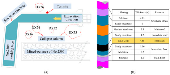 The Xiahuo Coal Mine, situated in Changzhi City, Shanxi Province, China, is characterized by complex geological conditions. Notably, the mine is heavily influenced by faults and collapse columns, resulting in soft and fragmented rock surrounding its roadways. This complexity poses significant challenges for roadway support, particularly in the 2308 return air roadway. Within a 200 m radius north and south of this roadway, there are four collapse columns, and the Zhujiazhuang syncline is situated approximately 1000 m south of the roadway entrance (see Figure 2a). The 2308 return air roadway’s No. 3 coal seam has a buried depth of 451 m, a thickness of 4.65 m, and a dip angle of 3.5° (see Figure 2b).