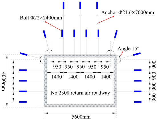 The supporting section of the 2308 return air roadway is shown in Figure 3. The rectangular roadway was excavated along the roof of the coal seam, and the roadway size was 5.6 m × 4.0 m (width × height). The support structure employs a “bolt-mesh-cable” combination: the bolts are Φ22 mm × 2400 mm; the plates are Φ170 mm × 10 mm arched steel; the designed pre-tightening torque is set at 300 N·m. For anchoring, resin agents MSK2335 and MSZ2360 were utilized.