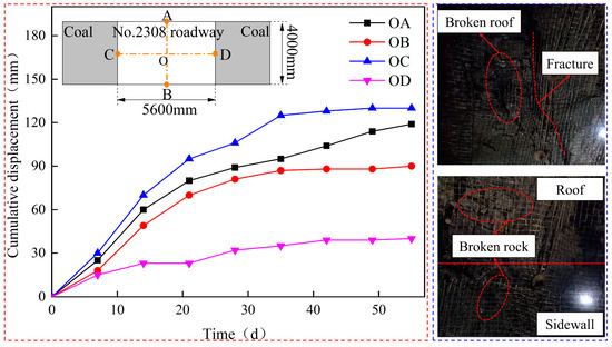 Deformation monitoring results of surrounding rock in the 2308 return air roadway. (Four points A, B, C and D respectively represent the displacement monitoring points of the roof, floor and two sides of the roadway respectively.)