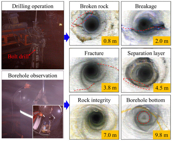 As shown in Figure 5, an examination of the surrounding rock within the 0.0 m to 1.0 m range from the 2308 return air roadway roof reveals significant fragmentation, leading to a reduced bearing capacity in the rock mass. Between 1.0 m and 4.0 m, the rock mass appears comparatively intact, although some sections display less-developed longitudinal fractures. At a depth of 4.5 m, a distinct separation layer becomes evident between the immediate and main roofs. Furthermore, from 5.0 m to 10.0 m, the rock mass shows a high degree of integrity. Owing to PTFL, the bolts are unable to effectively constrain the deformation of the surrounding rock. This results in subsidence in both the shallow and deep rock strata, culminating in the formation of a pronounced separation layer at a depth of 4.5 m from the roof.