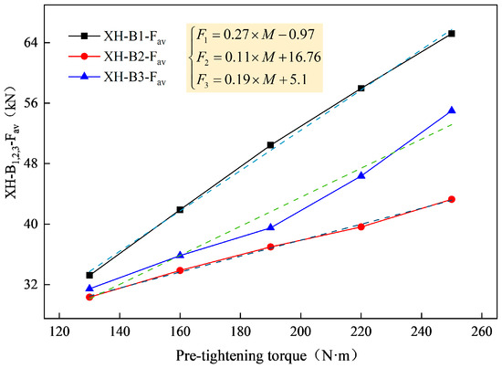The fitting curves in Figure 7 suggest a relationship between the average pre-tightening force of the bolt and the pre-tightening torque, which can be described by the following equation: