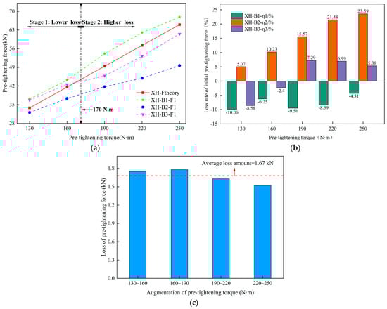 Comparison of the initial pre-tightening force of Bolts B1-B3 and their losses: (a) variation of initial pre-tightening force; (b) initial pre-tightening force loss rate; (c) histogram of average pre-tightening force loss variations.