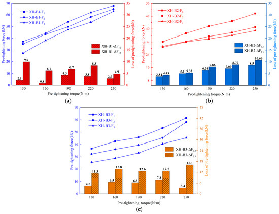 The dynamics of PTFL under repeated pre-tightening are depicted in Figure 9a–c, where the curves illustrate the variations in pre-tightening force, and the histograms represent the differences between F1 and F2 (ΔF12 indicating the PTFL from the first to the second pre-tightening) and between F1 and F3 (ΔF13 representing the PTFL from the second to the third pre-tightening) for each bolt.