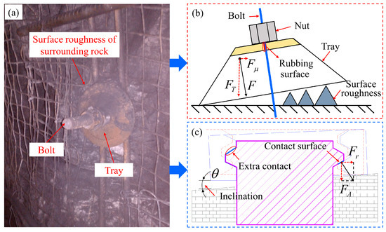 Field conditions of surrounding rock on the roadway surface: (a) surface roughness of surrounding rock; (b) bolt-plate extra friction; (c) bolt-nut extra friction.
