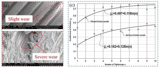 Damage characteristics of the material surface and variation of friction coefficients under repeated pre-tightening: (a) nut is tightened once; (b) nut is tightened for five times; (c) variation of friction coefficient.
