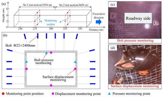 Layout of the test roadway and the mine pressure monitoring station: (a) field test sections; (b) layout monitoring stations; (c) bolt pressure monitor; (d) surface displacement monitor.