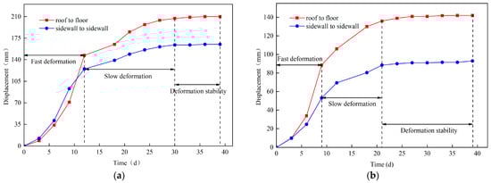 In this investigation, roadway deformation is categorized into three stages based on deformation velocity. The rapid deformation stage is defined by velocities exceeding 8 mm/d, while velocities ranging from 2 mm/d to 8 mm/d are considered indicative of the slow deformation stage. Velocities below 2 mm/d signify the stable deformation stage. As shown in Figure 13a and b, roadway deformation patterns under various pre-tightening conditions display similar trends. Initially, following roadway excavation, rapid deformation of the surrounding rock is observed. As excavation progresses, this rate of deformation steadily decreases. A notable observation is the onset of deformation in the No. 1 test section on the 30th day post-excavation, compared to the 21st day in the No. 2 test section. This difference underscores the efficacy of pre-tightening measures in significantly reducing the pre-tightening force loss, accelerating the effectiveness of bolt support, moderating stress redistribution, and diminishing the self-stabilization duration of the roadway in its early excavation phase.