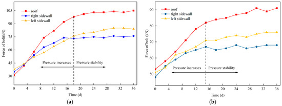 Figure 14a and b demonstrate that in the initial phase of support, the self-stabilizing durations for the pre-tightening force in the two test sections are 15 days and 10 days, respectively. This finding indicates that the application of pre-tightening measures effectively shortens the period required for the bolt to fully realize its support and load-bearing capabilities.