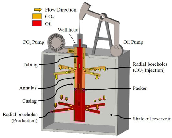 Inspired by the high cost of hydraulic fracturing and the enhanced oil recovery benefits of CO2 injection, this paper proposes for the first time a new approach for CO2-enhanced shale oil development using “vertical wells + radial boreholes”. As depicted in Figure 1, multiple hydraulically created radial boreholes are drilled in the upper and lower layers of a vertical well within the shale oil reservoir, with one layer serving as the CO2 injection zone and the other as the oil production layer. This method can expand the flow range of shale oil and increase production per well on a single-well basis. The deployment of radial boreholes is flexible, allowing for the bypassing of interlayers; and the drilling and production costs of this method are significantly lower than those of hydraulic fracturing [33], making it a promising new method for the safe and efficient development of shale oil reservoirs. However, the effectiveness of the radial boreholes CO2 EOR method in developing shale oil reservoirs remains to be verified. Reservoir numerical simulation methods have long been used to predict the flow dynamics of crude oil during CO2 EOR and the subsurface storage dynamics of CO2 [34,35], and are capable of analyzing a variety of wellbore configurations, including multi-lateral and fishbone wells [36,37]. Leveraging these research methodologies could enable the effective analysis of the dynamics of CO2 EOR using radial boreholes.