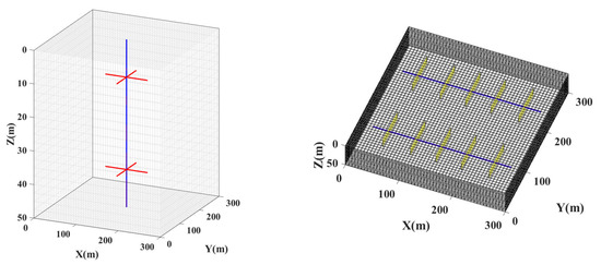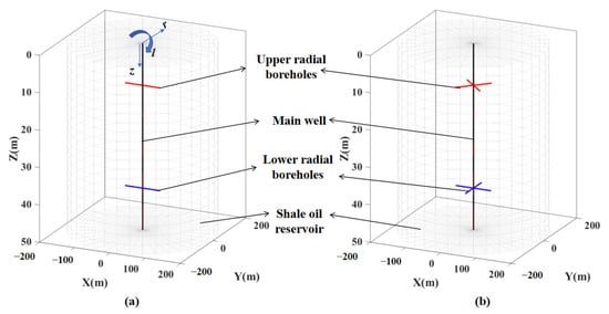 This study situates a vertical well at the center of a reservoir with a 200 m radius and 50 m height. Schematic representations of two radial borehole configurations are illustrated in Figure 2. At depths of 12 m and 38 m, two layers of radial boreholes are installed, each comprising either two or four boreholes. For the two-boreholes configuration, the boreholes across both layers maintain no phase difference, while a 45° phase angle is set between layers in the four-boreholes configuration. The length and radius of the radial boreholes are 50 m and 50 mm, respectively. The boreholes in the same layer maintain consistent angular separation between each other. The vertical well is indirectly connected to the reservoir; fluids enter the radial boreholes and are gathered into the vertical well before flowing to the surface. In the primary scenario of this study, radial boreholes extend 30 m, with a diameter of 30 mm. The upper boreholes are designated for CO2 injection and the lower for oil extraction, with injection and production pressures set at 66.02 MPa and 46.02 MPa, respectively, over a simulated production span of five years. Additional parameters within the reservoir are provided in Table 1.