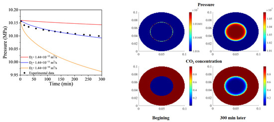 To verify the accuracy of the model, this paper initially employed experimental data derived from a radial constant volume diffusion device to validate the diffusion and adsorption accuracies. This device operates by placing shale oil samples saturated with oil in a CO2 environment. Due to diffusion and adsorption effects, CO2 migrates into the core, causing a drop in the environmental pressure. As illustrated in Figure 3, when the diffusion coefficient is small, the ability of CO2 to penetrate the core weakens, hence the trend of environmental pressure decline over time diminishes. When the core’s diffusion coefficient is around 10–11 m2/s, the results closely align with the experimental findings of Peng et al. [59], indicating the effectiveness of the diffusion and adsorption model. It is important to note that since there is no significant change in environmental pressure, adsorption has a minimal impact on the results. Additionally, the intensity of CO2 diffusion in shale oil reservoirs remains not fully determined [57], thus this paper adopts larger numerical values to make the impact of diffusion more pronounced.