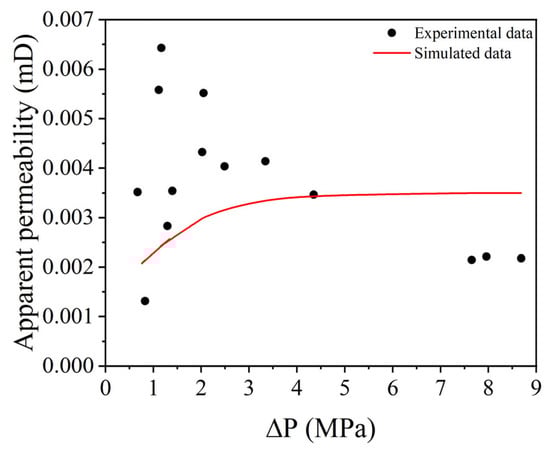 For the non-Darcy law of liquids, the non-Darcy law proposed by Peng and Sheng has been widely applied and recognized, aligning with the adsorption layer theory in pipe flow. However, due to the heterogeneity of shale and complex flow mechanisms, it may not entirely fit the pressure drop to flow rate relationship, as illustrated. As shown in Figure 4, the Equation (5) shows some deviation in predicting core data compared to the empirical data from Li et al. [60], though experimental values still distribute around the predicted data. When applying Equation (5), a pressure differential of around 2 MPa can cause an approximate 50% error in apparent permeability, leading to an underestimation of production, while a pressure differential exceeding 5 MPa might result in overestimation. In the cores used by Li et al., apparent permeability decreases under high pressure differentials. The authors suggest this phenomenon might be due to larger pores being accessible at higher pressures, increasing resistance. Currently, no mature model can fully explain this phenomenon. We plan to model this behavior in the future and analyze its impact on the CO2-enhanced development of shale oil.