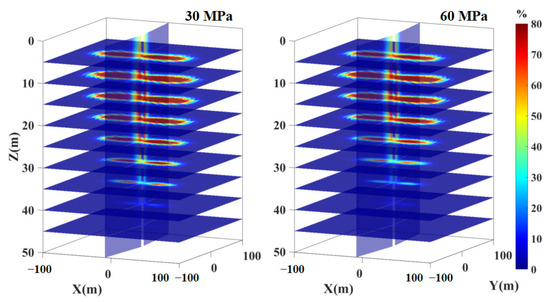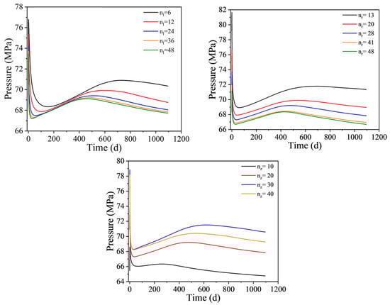 In Section 4.1, based on a formation pressure of 60 MPa, we varied the number of circumferential grids (nl), radial grids (nr), and vertical grids (nz), taking the bottom-hole pressure of the injection well as a reference. As shown in Figure 6, it was observed that the variations in nl, nr, and nz become minimal when they exceed 36, 28, and 20, respectively. It is important to note that when altering the number of vertical grids, the relative positioning of the wellbore and the grids also impacts the changes in bottom-hole pressure. To optimize computational efficiency, this study selects 36, 28, and 20 as the respective values for nl, nr, and nz.