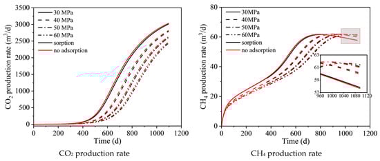 In scenarios where adsorption occurs, CO2 production is observed to be lower compared to cases without adsorption, attributable to a portion of CO2 being adsorbed within the reservoir matrix. Regarding CH4, prior to gas channeling, a certain amount of CH4 is adsorbed in the matrix, resulting in reduced CH4 production compared to situations where adsorption is not a factor. However, the regions traversed by CO2 experience desorption of the initially adsorbed CH4, facilitated by competitive adsorption, thereby releasing more CH4. Consequently, CH4 production post-gas channeling, in the presence of adsorption, exceeds that observed in the absence of adsorption.