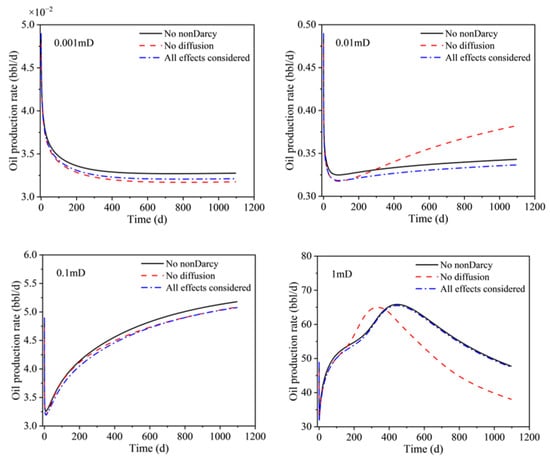 In the presence of non-Darcy flow, the flow capacity of the liquid phase is influenced by the permeability of the reservoir. As permeability decreases, the coefficient “a” in the relevant formula increases, leading to a higher value of ηNl and, consequently, a reduced flow capacity of the liquid phase. Conversely, lower permeability results in smaller matrix pore sizes, as inferred from Equation (11). This smaller pore size leads to a reduced value of Kn, as per the equation, and an increased value of ηNg, according to Equation (8), implying an enhanced gas flow capacity with decreasing permeability. Figure 9 and Figure 10 illustrate how these opposing effects neutralize each other, culminating in an overall reduction in production due to non-Darcy effects at low permeability levels. However, when permeability exceeds 1 mD, both ηNl and ηNg approach 1, indicating that liquid and gas phases flow by Darcy’s law. For instance, at permeabilities of 0.001 mD and 1 mD, the oil production rate in the third year under non-Darcy conditions is 0.98 and 0.99 times, respectively, of the rate under Darcy conditions. Notably, production characteristics typically associated with lower permeabilities can be observed in the early stages of production in higher-permeability contexts.