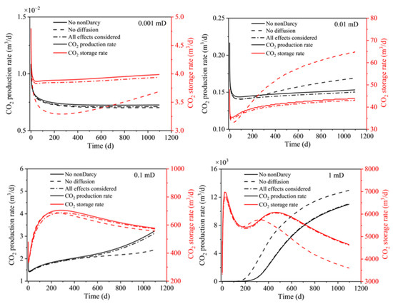 At a matrix permeability of 0.0001 mD, the reservoir’s extreme density renders the pressure gradient insufficient to effectively drive oil and gas flow. Under these conditions, the diffusion of components emerges as a significant driving mechanism for the movement of both oil and CO2. Consequently, if diffusion is not factored in, the rates of oil production, CO2 production, and CO2 storage are observed to be lower. It is crucial to clarify that the CO2 production in this scenario refers to the CO2 originally present in the reservoir, rather than the CO2 that has been injected.