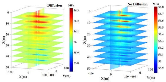 With a matrix permeability of 0.01 mD, the injected CO2 predominantly accumulates around the injection radial boreholes, and fluid flow primarily occurs in the horizontal direction. In this scenario, the reservoir pressure has not yet reached a complete steady state. When diffusion is accounted for, CO2 tends to flow more readily toward the reservoir boundary. This diffusion effect results in a smaller horizontal pressure gradient compared to the scenario where diffusion is not considered, as illustrated in Figure 11. Consequently, the CO2 injection rate, when diffusion is not factored in, is marginally higher than the rate with diffusion considered. Similarly, the oil production rate is slightly higher when diffusion is taken into account compared to when it is not.