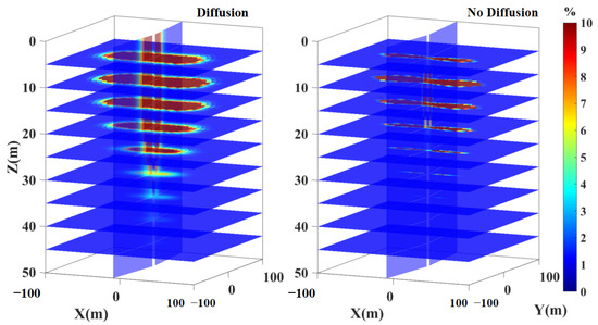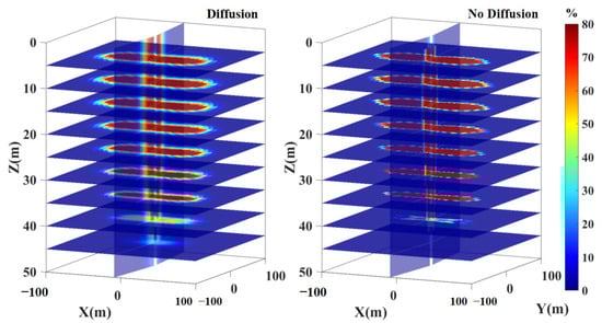 At a matrix permeability of 0.1 mD, the predominant direction of fluid flow transitions from horizontal to vertical as the reservoir pressure gradually stabilizes into a steady state. In such a scenario, the vertical pressure gradients, whether diffusion is considered or not, are equivalent. As a result, the oil production rates are essentially identical under both conditions. However, the diffusion effect of CO2 leads to a more rapid vertical migration when diffusion is taken into account. This phenomenon is demonstrated in Figure 12. Therefore, when considering diffusion, the onset of CO2 gas channeling occurs earlier compared to scenarios where diffusion is not factored in.