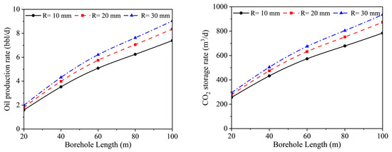 Effects of radial borehole length and diameter on oil production and CO2 storage.