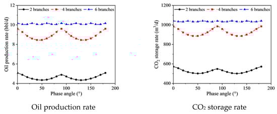 When the phase angle is small, resulting in a larger pressure differential, each branch of the radial boreholes exhibits increased oil production and greater CO2 storage capacity. For instance, with a four-branch system, a phase angle of 0° yields an oil production rate 1.14 times higher than that at a phase angle of 40°. However, it is important to note that a higher number of radial boreholes, combined with a phase angle of 0°, can also lead to more pronounced gas channeling in the later stages of CO2 injection. This increased gas channeling could accelerate the decline in oil production rates. Nonetheless, the detailed analysis of these effects falls outside the scope of this paper.