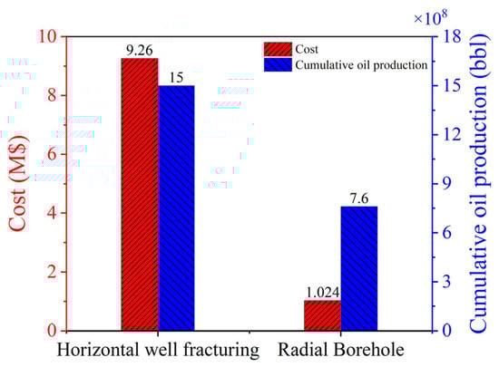 Comparison of costs and oil production between CO2-enhanced radial borehole development for shale oil and dual horizontal well fracturing CO2-enhanced development.