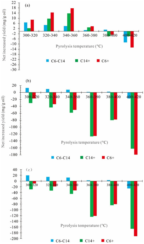 - 360–420 °C (0.79%Ro–1.47%Ro): Residual oil pyrolysis stage. The continuous increase of the temperature leads to the pyrolysis of the residual oil retained in the alumina particles in the reactor. As a result, the total residual oil decreases rapidly, the expelled oil continues to increases rapidly, and the generation rate of gas hydrocarbons (C1–5) increases rapidly.