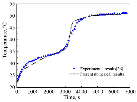 To validate the accuracy of the numerical model, Figure 3 exhibits a comparative analysis of the simulated and experimental outcomes [36]. It was found that the maximum difference between them was 8.7% by comparing and analyzing the simulated data with the measured data. In addition, the average difference between the simulated and measured data was 1.3%. These discrepancies can be ascribed to two factors. First, the convective heat transfer coefficient (3 W/(m2·K)) was assumed to be constant when performing the numerical simulations, while 298 K was considered to be the temperature at which the ambient temperature was maintained at all times. Some simplification of the boundary conditions was calculated. Second, the treatment of the specific heat of the PCM as a constant in the simulations does not align with the experimental data. Thus, it can be inferred that the current numerical outcomes align with the experimental outcomes in the literature [36]. The numerical model is suitable for further computation in this research.