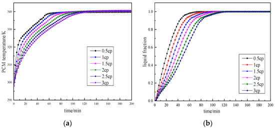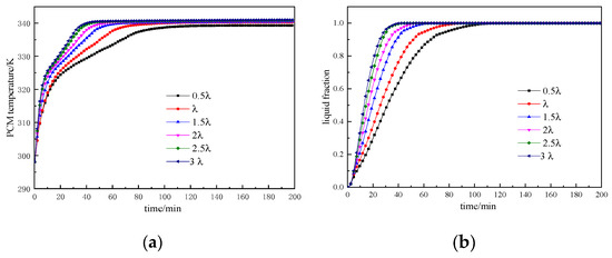 Instantaneous temperature and melting fraction of the PCM for various ((a) temperature; (b) melting fraction).