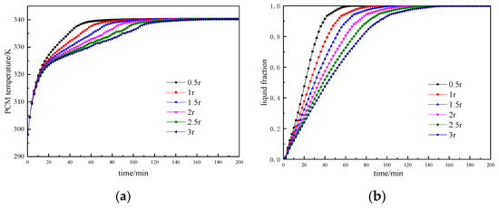 Instantaneous temperature and melting rate of PCMs with varying r ((a) temperature; (b) melting fraction).