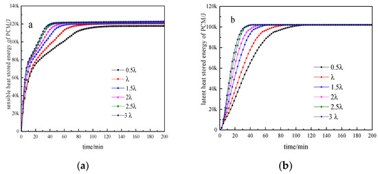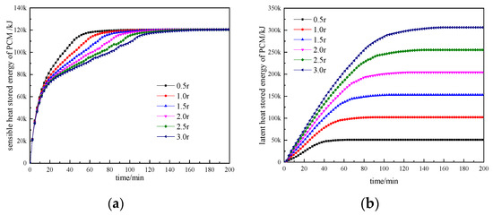 Instantaneous sensible and latent heat-stored energy of the PCM for various ((a) sensible heat-stored energy; (b) latent heat-stored energy).